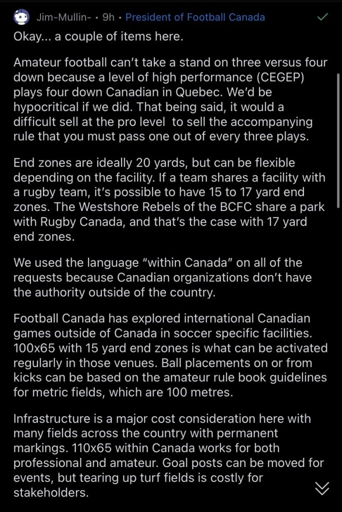 The question of rules is heavily on the mind of people like Jim Mullins, president of Football Canada. Football Canada is the body that looks over Amateur Football in Canada. Any changes to the CFL rules could significantly impact how Amateur Football is played in Canada.